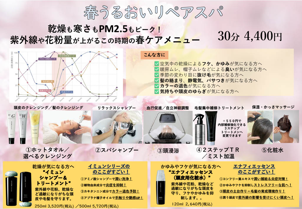 「最近フケやかゆみが気になる」「髪のパサつきをどうにかしたい」という方は、ご予約時に「春うるおいリペアスパ希望」とお伝えください。